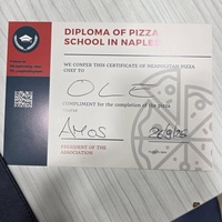 Kokken meldte seg pizzakurs på Napolitan school of pizza og lærte seg å lage ekte Napolitansk pizza. Og ble belønnet med diplom som sertifikat for gjennomført kurs som: Chef of Napolitan Pizza.